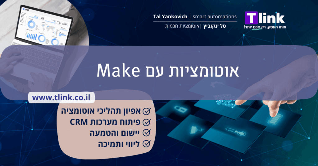 תמונה ראשית שלי עם מחשב נייד והכותרת של אוטומציה באמצעות התוכנה make